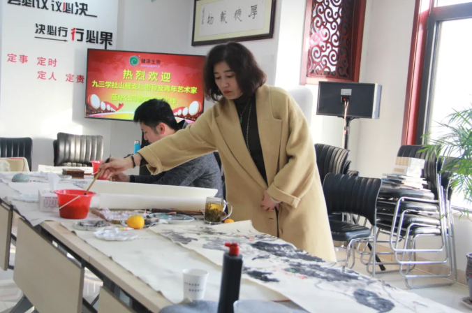 2020年11月6日,九三學(xué)社山東服裝學(xué)院支社侯家華主委攜泰安市青年藝術(shù)家們一行7人專程來到山東健源生物參觀指導(dǎo)、現(xiàn)場作畫,并傳授書畫藝術(shù)的精髓,弘揚(yáng)傳統(tǒng)文化。