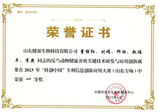 山東健源生物科技有限公司《反芻動(dòng)物健康養(yǎng)殖關(guān)鍵技術(shù)研發(fā)與應(yīng)用》項(xiàng)目榮獲2023年科創(chuàng)中國(guó)專利信息創(chuàng)新應(yīng)用大賽(山東專場(chǎng))一等獎(jiǎng)