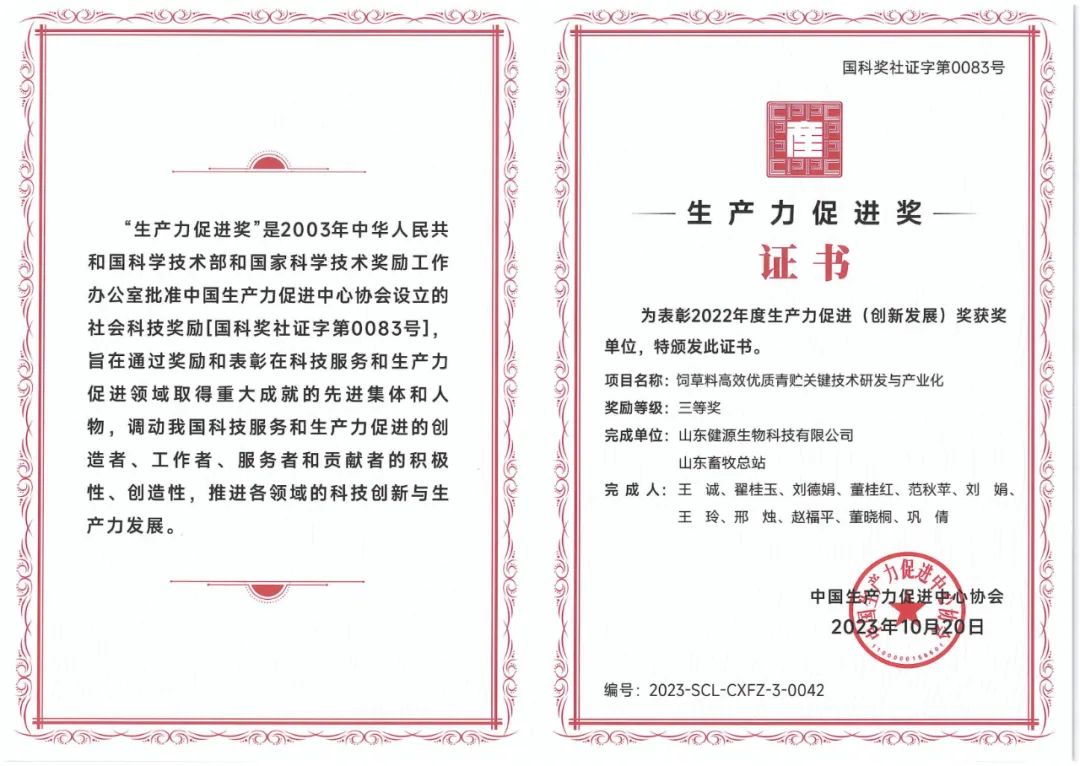 12月9日,2023中國生產(chǎn)力促進(jìn)中心協(xié)會(huì)年會(huì)暨第十六屆寰宇生產(chǎn)力論壇生產(chǎn)力創(chuàng)新發(fā)展大會(huì)在北京成功召開,山東健源生物科技有限公司“飼草料高效優(yōu)質(zhì)青貯關(guān)鍵技術(shù)研發(fā)與產(chǎn)業(yè)化”項(xiàng)目榮獲2022年度生產(chǎn)力促進(jìn)(創(chuàng)新發(fā)展)獎(jiǎng)三等獎(jiǎng)。