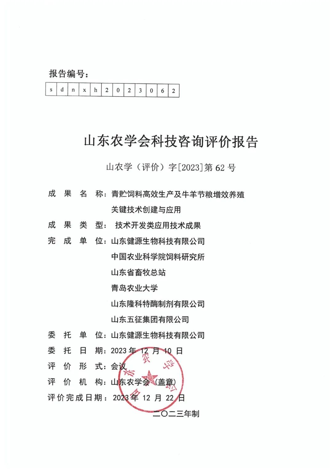 2023年12月22日,由山東健源生物科技有限公司聯(lián)合中國農(nóng)業(yè)科學院飼料研究所、山東省畜牧總站、青島農(nóng)業(yè)大學、山東五征集團有限公司、山東隆科特酶制劑有限公司完成的“飼草料高效生產(chǎn)及節(jié)糧增效養(yǎng)殖關鍵技術創(chuàng)建與應用”項目順利通過了科技成果評價。