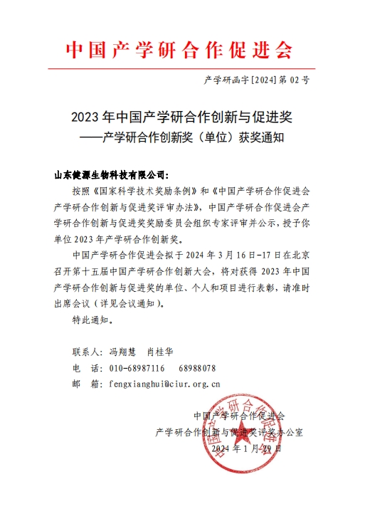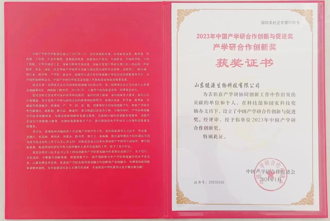大會表彰了2023年在產(chǎn)學(xué)研協(xié)同創(chuàng)新工作中做出突出貢獻(xiàn)的單位和個人。山東健源生物科技有限公司被中國產(chǎn)學(xué)研合作促進(jìn)會授予2023年中國產(chǎn)學(xué)研合作創(chuàng)新獎。