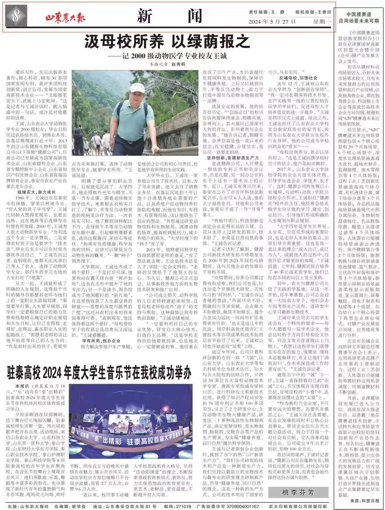 發(fā)布時間:[2024-6-1 17:23:41] 瀏覽量:2851次日前,王誠董事長作為山東農(nóng)業(yè)大學(xué)校友接受《山東農(nóng)大報》桃李芬芳欄目采訪。報道發(fā)表在《山東農(nóng)大報》第1447期第8版,講述了王誠董事長求學(xué)創(chuàng)業(yè)之路,以實際行動反哺母校,先后被山東農(nóng)業(yè)大學(xué)聘為“創(chuàng)新創(chuàng)業(yè)導(dǎo)師”和“研究生校外行業(yè)導(dǎo)師”,擔(dān)任山東畜牧獸醫(yī)學(xué)會副理事長、山東畜牧獸醫(yī)學(xué)會反芻動物科技專業(yè)委員會秘書長、副理事長。2023年被聘請為山東農(nóng)業(yè)大學(xué)校友會泰安聯(lián)絡(luò)處理事會秘書長,并被授予“優(yōu)秀校友工作者”榮譽稱號,健源生物是山東農(nóng)業(yè)大學(xué)“校友之家”單位、動物科技學(xué)院“教育科研實踐就業(yè)基地”。
