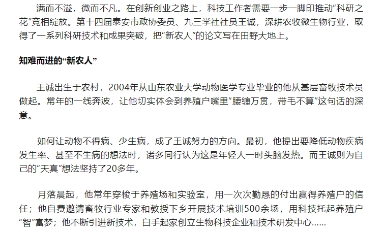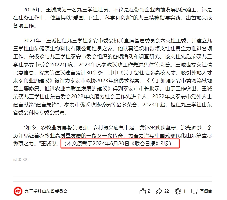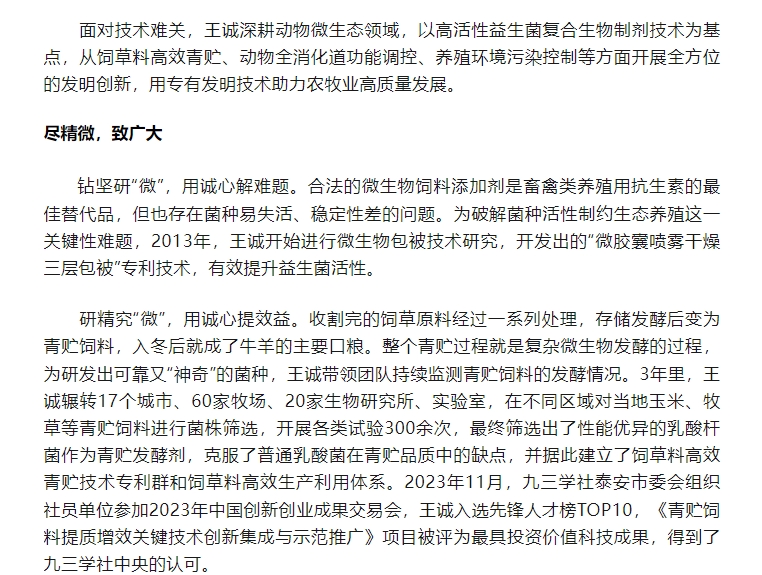 日前,王誠董事長接受了聯(lián)合日報(bào)記者的采訪,報(bào)道發(fā)表在2024年6月20日《聯(lián)合日報(bào)》3版,講述了王誠董事長作為“新農(nóng)人”,20多年來深耕微生態(tài)領(lǐng)域,以高活性益生菌符合生物制劑技術(shù)為基點(diǎn),從飼草料高效青貯、動物全消化道功能調(diào)控、養(yǎng)殖環(huán)境污染控制等方面開展全方位的發(fā)明創(chuàng)新,用專有發(fā)明技術(shù)助力農(nóng)牧業(yè)高質(zhì)量發(fā)展。而作為一名九三學(xué)社社員,王誠董事長堅(jiān)持以“愛國、民主、科學(xué)和創(chuàng)新”的九三精神指導(dǎo)實(shí)踐,出色地完成各項(xiàng)工作。該報(bào)道同時(shí)被九三學(xué)社山東省委員會轉(zhuǎn)載報(bào)道。
