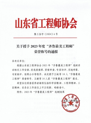 為全面貫徹落實習近平總書記關(guān)于人才工作的重要講話精神,大力弘揚科學家精神、工匠精神,激發(fā)動員廣大工程技術(shù)人才守正創(chuàng)新、砥礪奮斗。按照中共山東省委人才工作領導小組辦公室《關(guān)于進一步加強卓越工程師隊伍建設的若干措施的通知》要求,山東省工程師協(xié)會在全省開展了2023年度“齊魯最美工程師”選樹工作。經(jīng)選拔推薦、資格審查、專家初評、實地考察、專家高評、結(jié)果公示等程序,決定授予王誠等10人“齊魯最美工程師”榮譽稱號。