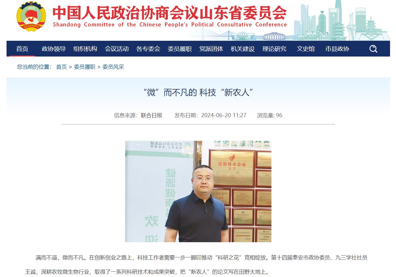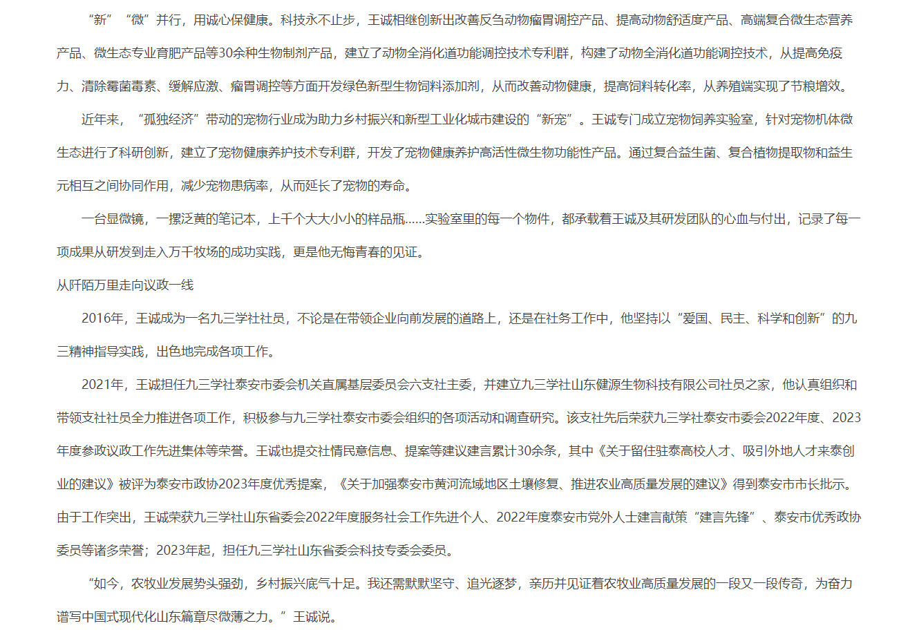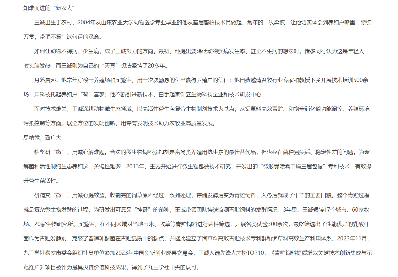 發(fā)布時間:[2024-8-7 15:16:1] 瀏覽量:3316次近日,中國人民政治協(xié)商會議山東省委員會官網(wǎng)推送《“微”而不凡的 科技“新農(nóng)人”》文章,報道山東健源生物科技有限公司董事長王誠作為“新農(nóng)人”,20多年來深耕微生態(tài)領(lǐng)域,以高活動性益生菌復(fù)合生物制劑技術(shù)為基點,從飼草料高效青貯、動物全消化道功能調(diào)控、養(yǎng)殖環(huán)境污染控制等方面全方位的發(fā)明創(chuàng)新,用專有發(fā)明技術(shù)助力農(nóng)牧業(yè)高質(zhì)量發(fā)展。而作為一名九三學(xué)社社員,王誠董事長堅持以“愛國、民主、科學(xué)和創(chuàng)新”的九三精神指導(dǎo)實踐,出色地完成各項工作。全文如下: