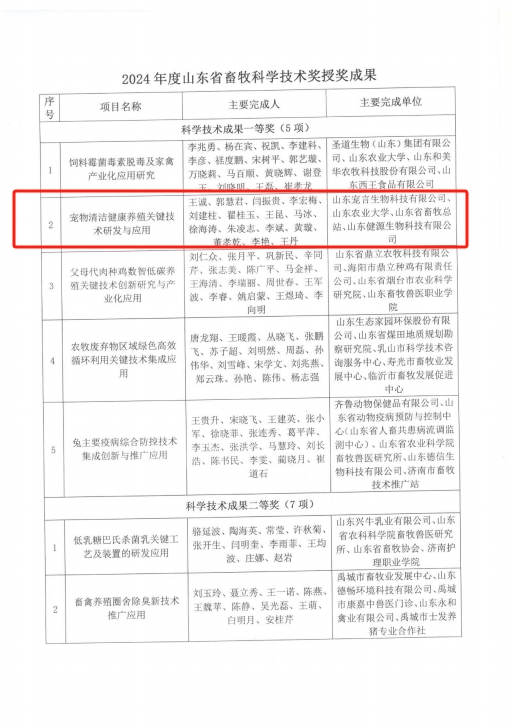 近日,山東省畜牧協(xié)會公布了2024年山東省畜牧科學(xué)技術(shù)獎獲獎名單。山東健源生物科技有限公司與子公司山東寵言生物科技有限公司共同完成的“寵物清潔健康養(yǎng)殖關(guān)鍵技術(shù)研發(fā)與應(yīng)用”項目,憑借其創(chuàng)新性與實用性,榮獲山東省畜牧科學(xué)技術(shù)獎科學(xué)技術(shù)成果獎一等獎。