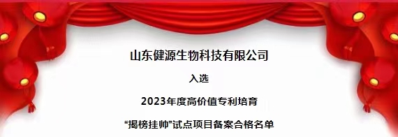 山東健源生物科技有限公司 入選 2023年度高價(jià)值專利培育 “揭榜掛帥”試點(diǎn)項(xiàng)目備案合格名單 日前...