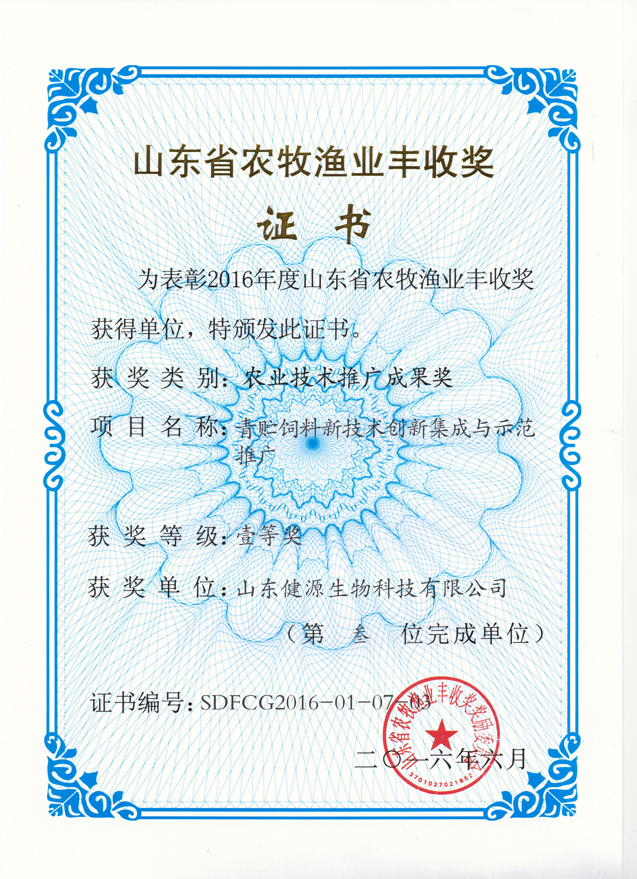 2017-1-10 健源生物榮獲“山東省農(nóng)牧漁業(yè)豐收獎(jiǎng)–壹等獎(jiǎng)”殊榮