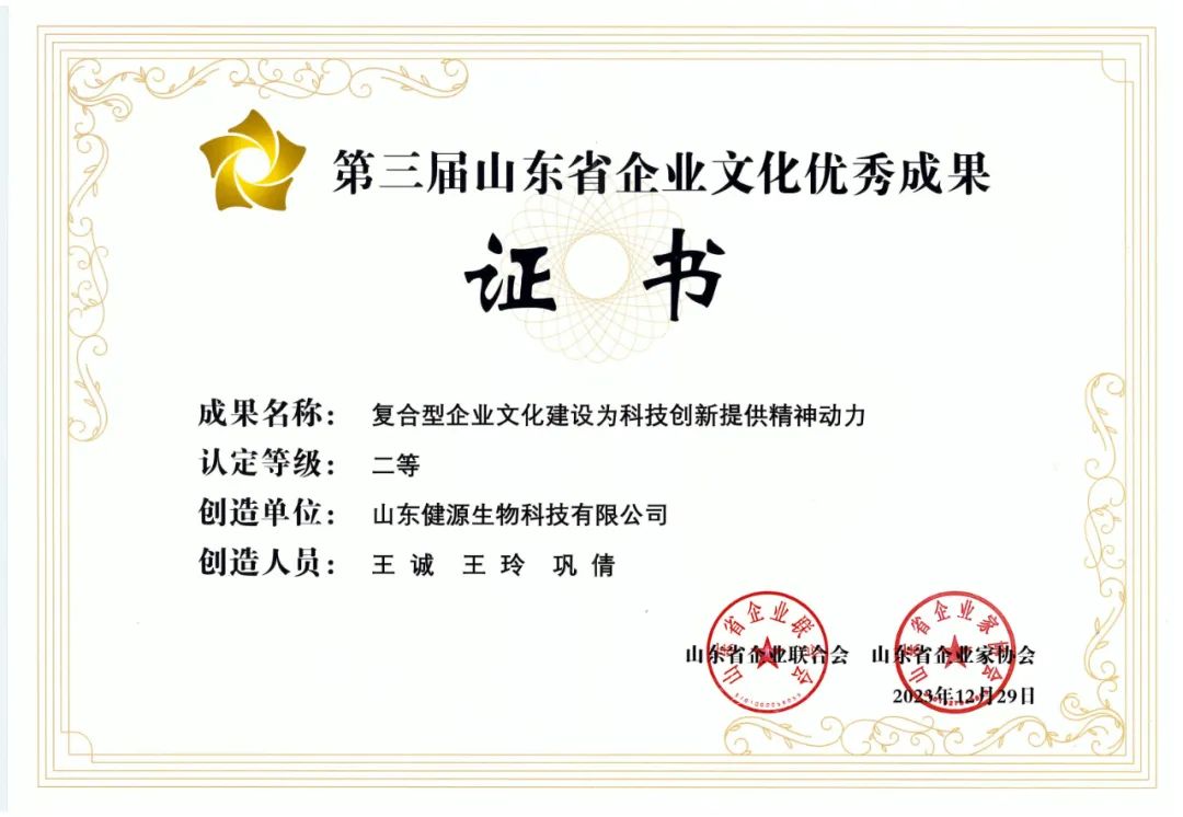 熱烈祝賀 山東健源生物科技有限公司 榮獲 第三屆山東省企業(yè)文化優(yōu)秀成果 二等獎 1月23日-...