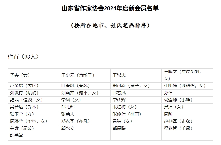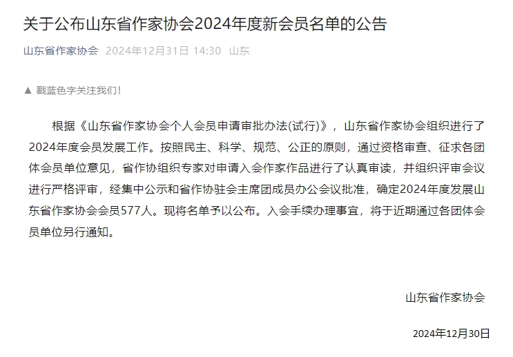 根據(jù)《山東省作家協(xié)會個人會員申請審批辦法(試行)》,山東省作家協(xié)會組織進行了2024年度會員發(fā)展工作。按照民主、科學、規(guī)范、公正的原則,通過資格審查、征求各團體會員單位意見,省作協(xié)組織專家對申請入會作家作品進行了認真審讀,并組織評審會議進行嚴格評審,經(jīng)集中公示和省作協(xié)駐會主席團成員辦公會議批準,確定2024年度發(fā)展山東省作家協(xié)會會員577人。