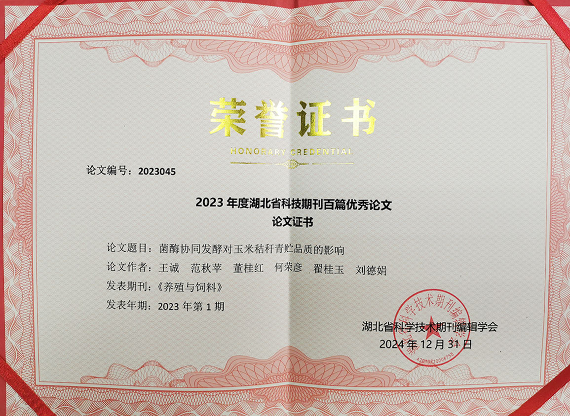 2025-1-15 健源生物發(fā)表在《養(yǎng)殖與飼料》的論文入選2023年度湖北省科技期刊百篇優(yōu)秀論文